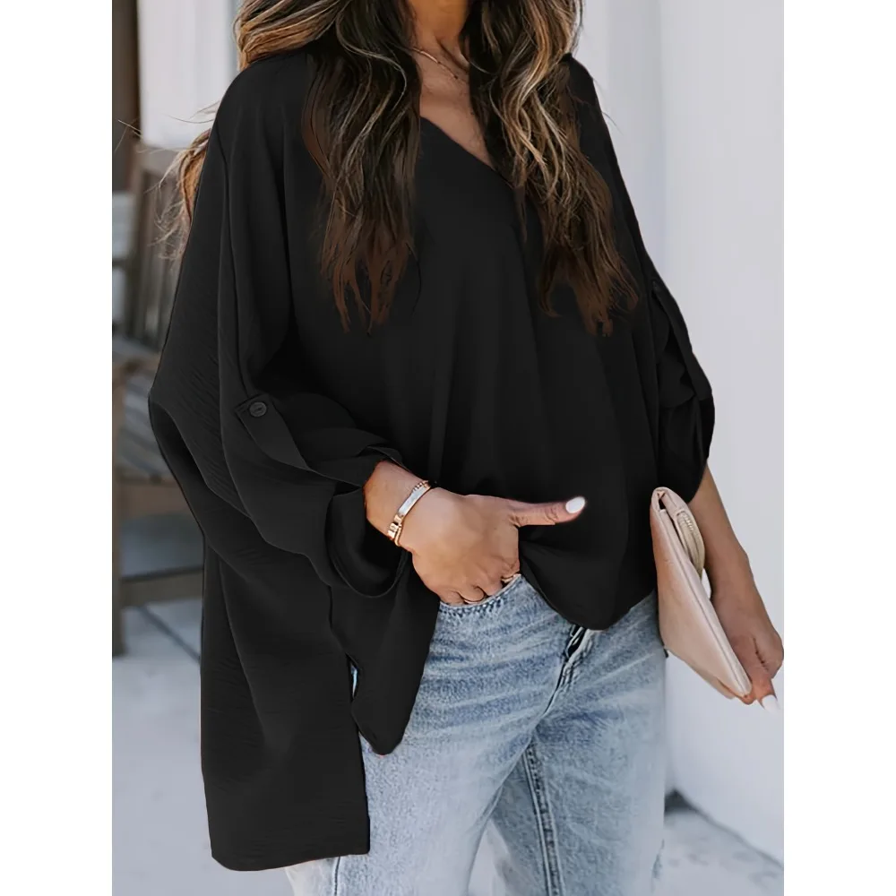 Plus Size 1XL-5XL Women’s Casual Casual Roll Up Sleeve V Neck Blouse Ladies Fashion Long Sleeve Blouse Loose Shirt